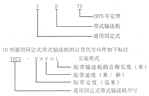 TD型通用固定式帶式輸送機的產(chǎn)品代號為TD75,其意義如下: